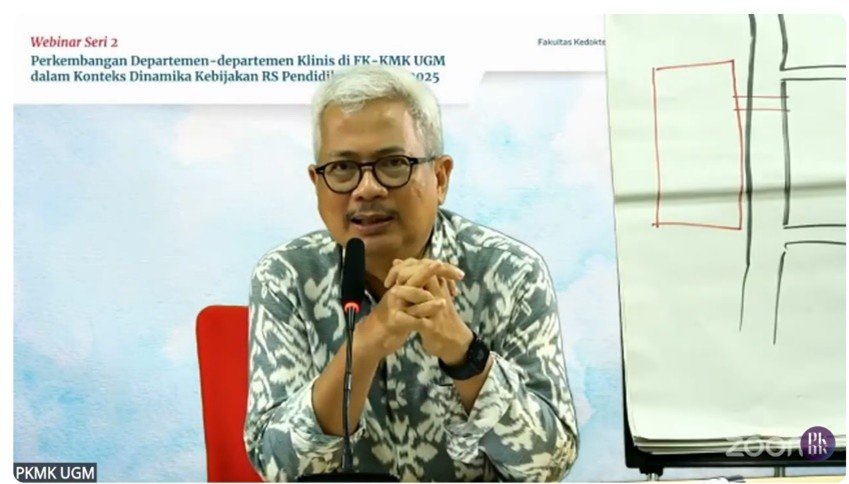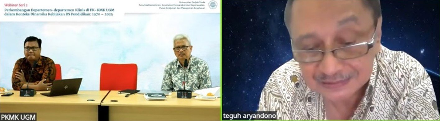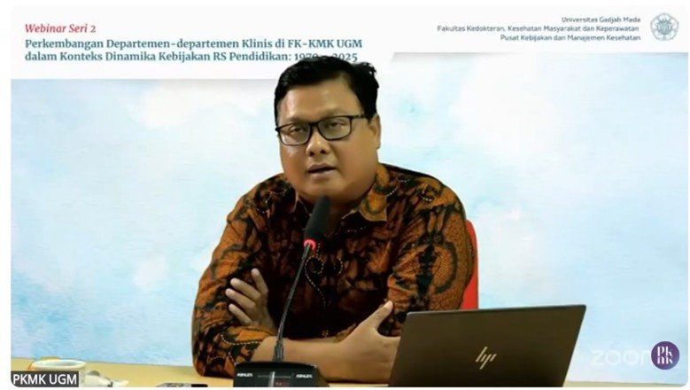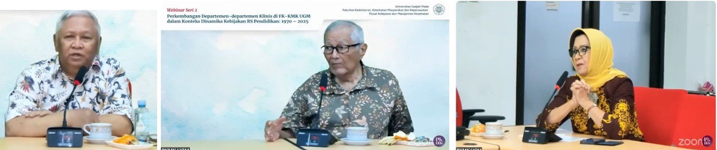 PKMK-Yogya. Pusat Kebijakan dan Manajemen Kesehatan (PKMK UGM) menyelenggarakan webinar sejarah kesehatan dalam rangka Dies Natalis ke-80 FK-KMK UGM. Kegiatan ini dilaksanakan secara hybrid dan diikuti oleh peserta dari kalangan dosen, mahasiswa, alumni, praktisi kesehatan, serta masyarakat umum. Webinar mengangkat tema perkembangan departemen-departemen klinis di FK-KMK UGM dalam konteks dinamika kebijakan rumah sakit pendidikan sejak 1970 hingga 2025. Kegiatan ini dipandu oleh Aulia Putri Hijriyah, S. Sej. selaku moderator. Diskusi diarahkan untuk menelusuri relasi historis antara institusi pendidikan kedokteran dan rumah sakit pendidikan, serta bagaimana dinamika kebijakan publik memengaruhi struktur departemen klinis dan pendidikan dokter spesialis.